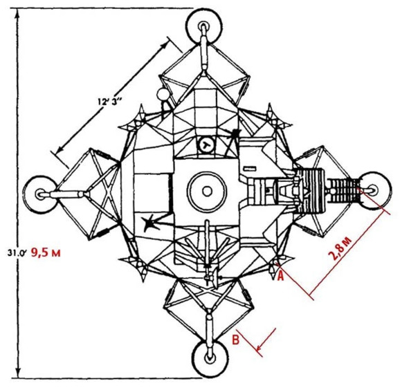 Размеры посадочной платформы, ширина составляет без стоек всего 5,6 метров. Ширина стоек менее 0.5 метра. На снимках индусов эти стойки зафиксировать невозможно. Индусы сообщают о малом разрешении своей фотоаппаратуры и телекамер, всего 5 метров на 1 пиксель: «Камера для отображения местности (TMC), которая имела пространственное разрешение 5 метров (16 футов) на 1 пиксель». [9] Это цифра означает, что такая камера ни при каких обстоятельствах не сможет зафиксировать в подробностях «Лунный модуль» США, шириной более 10 пикселей. Именно столько пикселей, приблизительно помешается в представленных кадрах, где изображен «ЛМ» и вокруг него тропинки, инструменты, флаги. Чтобы увидеть и зафиксировать такой объект он должен был иметь в диаметре 50 метров и более. Никакой речи быть не может о фиксации тропинок клоунов НАСА. Очевидно, что их ширина менее 5 метров.