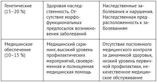 Во-первых, это образ жизни, который человек создаёт себе сам – он более чем на 50 % определяет состояние здоровья. Во-вторых, это наследственно обусловленные биологические факторы – от них здоровье зависит на 20 %. Ещё на 20 % здоровье зависит от третьего фактора – внешних экологических условий проживания. И, наконец, четвёртый фактор – состояние медицины; его влиятельность составляет 10 %.
