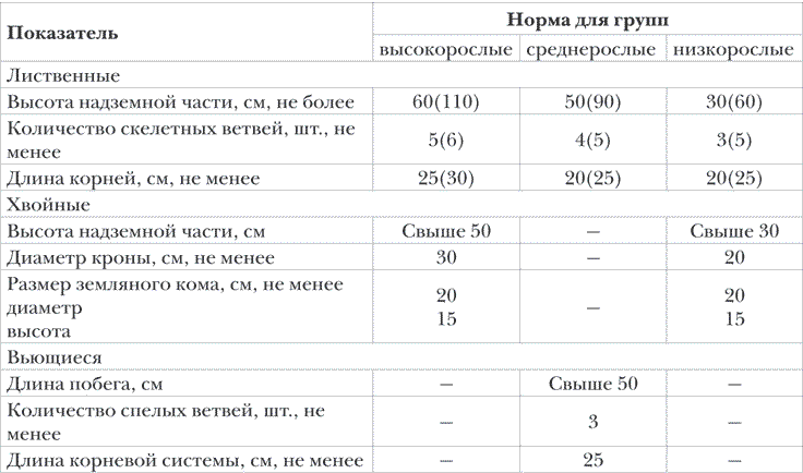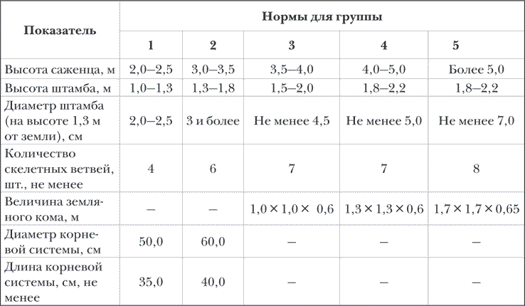 У оптимально развитых и здоровых растений, полностью готовых к окончательной посадке в грунт, основные параметры схожи. Саженцы лиственных пород деревьев подразделяются на 5 групп. Первые 2 группы включают в себя некрупные саженцы первого и второго сорта. Основным отличием первого сорта от второго будет правильная симметричная форма кроны. У второсортных растений крона может иметь асимметричное расположение ветвей, листва может быть редкая, ствол немного искривлен (не более 5 см от вертикали). К третьей группе относятся декоративные деревья среднего размера, к четвертой – среднекрупного, а к пятой – крупные древесные формы. Все параметры в таблицах перечислены для растений первого сорта (табл. 1).