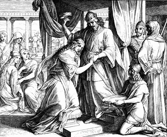 И Мордехай, иудей, служивший у Артаксеркса, привел к нему Эсфирь, племянницу, сироту, которая жила у него вместо дочери. Эсфирь была не только красива и девственна, она также была хорошо образованна, умна и умела заботиться о своей красоте, так что ежедневный туалет ее занимал не менее двух часов. Кроме того, она смогла вовремя проявить скромность и понравилась Загаю, главному царскому евнуху. Как сказано в Книге Эсфири: «И когда пришла очередь Эсфири… идти к царю, то не просила она ничего, кроме того, о чем сказал ей Загай, царский евнух, страж жен. И понравилась Эсфирь всем видевшим ее. И взята была Эсфирь к царю Артаксерксу в царский дом его в десятом месяце, то есть в месяце Тэвэте, на седьмом году его царствования».