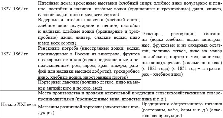 Места реализации алкогольных напитков подразделялись в правовых актах на кабаки (в разное время они назывались кружечные дворы, питейные дома), погреба, лавочки и магазины. Заведения, в которых наряду с различными товарами и услугами покупателям было разрешено предлагать алкоголь, начиная с XVIII века были обозначены единым термином – «трактирные заведения». К ним относились трактиры, герберги, гостиницы, рестораны и прочие. (см. табл. 4).