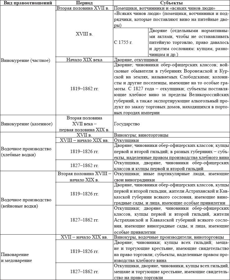 Субъекты, осуществляющие производство и оборот алкоголя в XVII – первой половине XIX вв., начале XXI века