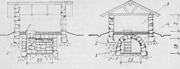 На рис. 9 изображен современный каменный погреб, сложенный из красного обожженного кирпича. Перекрытие погреба из горбыля, утепленного глиняной смазкой и землей.