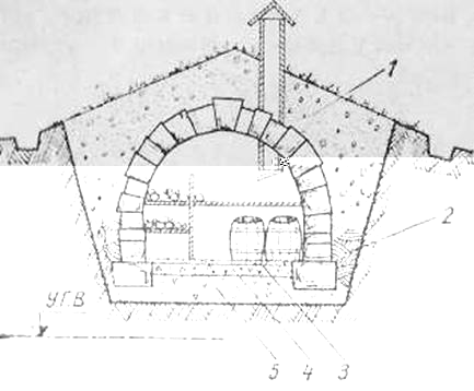 Рис. 8. Каменный погреб, сооруженный при низком уровне грунтовых вод: 1 – засыпка грунтом; 2 – глиняный замок; 3 – цементная стяжка; 4 – бетон; 5 – щебень