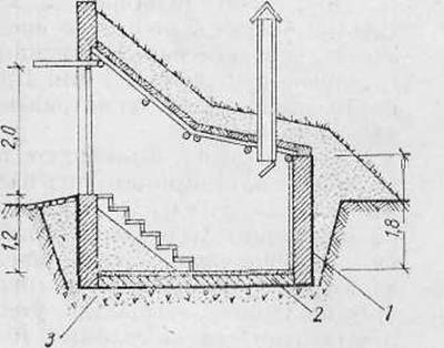 Рис. 9. Каменный погреб из красного кирпича: 1 – обмазка и проливка основания горючим битумом; 2 – бетон; 3 – утрамбованный щебнем грунт