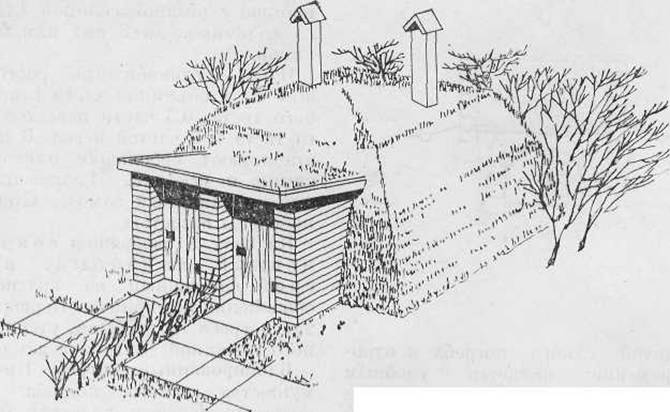 В районах с жарким летом погреб-ледник нужно обваловать грунтом, который будет служить дополнительной теплоизоляцией (рис. 12). С этой же целью вход в погреб делается с тамбуром.