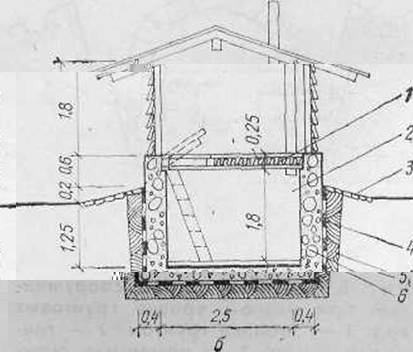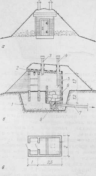 Рис. 12. Погреб-ледник: а – общий вид; 6 – разрез; в – план; 1 – крупнозернистый песок с щебнем; 2 – глиносоломенная смазка: 3 – вентиляционная груба (вытяжная); 4 – вентиляционная труба (приточная); 5 – наземная часть стен погреба (в полкирпича); 6 – стены льдохранилища; 7 – труба для стока талой воды в пониженные места или поглощающий колодец; 8 – трап для сбора и отвода талой воды