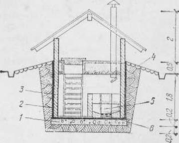 Рис. 11. Погреб с погребицей; а – общий вид; б – разрез; 1 – утеплитель; 2 – известковая побелка; 3 – отмостка; 4 – обмазка горячим битумом (2 мм); 5 – глиняный замок; 6 – бутобетон