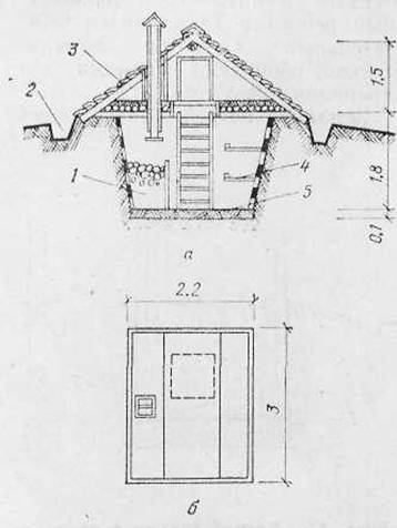 Рис. 14. Земляной погреб: а – разрез; б – план; 1 – закром для картофеля; 2 – водоотводная канава; 3 – скат крыши; 4 – полки; 5 – глинобитный пол