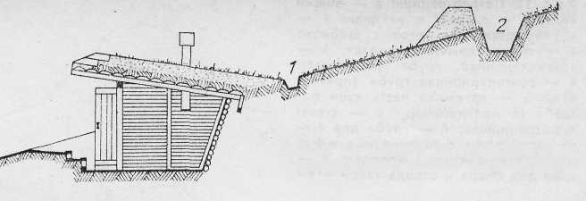 Рис. 15. Погреб на косогоре: 1 – водоотводная канава; 2 – нагорная канава