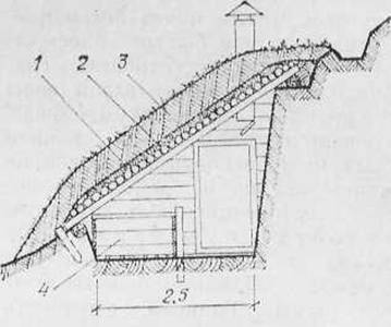 Рис. 16. Земляной погреб на косогоре (вариант): 1 – накатник; 2 – глина, 10 см; 3– грунт, 30 см; 4 – закром