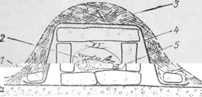 П е р е к р ы т и я выполняют из толстого притесанного горбыля или досок толщиной 50 мм. Концы досок, опирающиеся на кирпичную кладку, предварительно промазывают горячим битумом. Перекрытия утепляют слоем глино-соломы толщиной 20 см, а затем слоем земли толщиной не менее 50 см, на которую высеивают траву. Откосы стен укрепляют дерном.