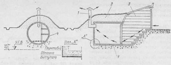 Рис. 18. Погреб из железобетонных колец: 1 – вытяжка; 2 – обваловка грунтом; 3 – входной тамбур; 4 – бетонные кольца