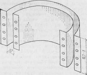 Технология изготовления б е т о н н ы х к о л е ц следующая. Вначале изготавливается о п а л у б к а из кровельного железа (рис. 19). На концах каждого полукольца опалубки просверливаются (пробиваются) несколько отверстий под болты с гайками для стягивания полуколец. Чтобы не порвать железа, под болты подкладываются широкие шайбы.