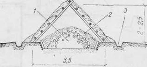 Рис. 20. Простейшее укрытие типа «шалаш» для картофеля и корнеплодов: 1 – картофель (корнеплоды); 2 – солома; 3 – водоотводная канава.