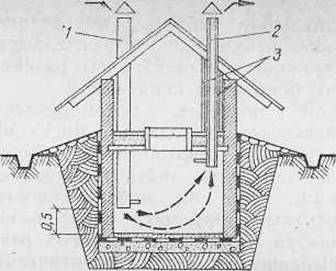 Перемещение воздуха по вентиляционным трубам происходит в результате разности удельных масс наружного и внутреннего воздуха, поэтому такая система вентиляции называется естественной. Скорость движения воздуха тем больше, чем выше разность температуры в погребе и снаружи.