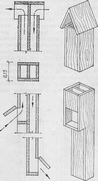 Для небольших погребов можно сделать одну вентиляционную трубу с ветроулавливанием (рис. 29), для чего ее разделяют по вертикали на два канала. По одному каналу воздух вгоняется в погреб, а по другому выталкивается наружу. Задвижку можно сделать самостоятельной для каждого канала.