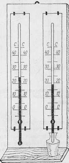 Психрометр легко сделать самим: два спиртовых термометра закрепляются рядом на общей подставке. Шарик одного из них плотно оборачивают батистом или марлей, смоченной в воде (лучше дистиллированной), шарик другого должен быть сухим (рис. 30). Смоченный термометр показывает температуру более низкую, чем сухой, так как влага с поверхности шарика непрерывно испаряется, а на испарение затрачивается тепло. По разности значений сухого и смоченного термометров с помощью специальной таблицы определяют абсолютную и относительную влажность и точку росы (причину появления конденсата).