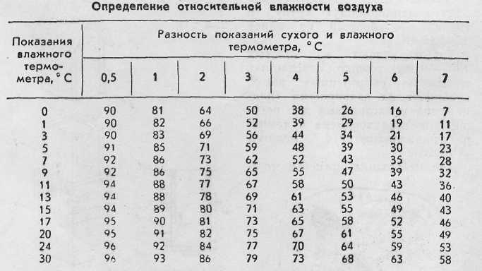 Примечание: Определив разность показаний термометров, находят соответствующие строки в таблице. Цифра, стоящая на пересечении этих строк, является показателем влажности. Например, показания сухого термометра 9є С, влажного 7є С, оазность показаний 2°. Следовательно, влажность воздуха в данном случае равна 73 %.