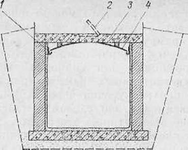 Рис. 31. Отвод конденсата и капежа с потолка погреба: 1 – желоб; 2 – люк; 3 – перекрытие; 4 – зонт из кровельного железа