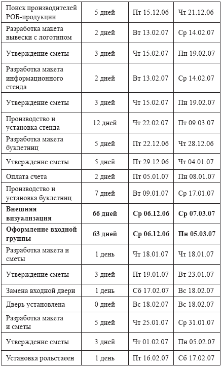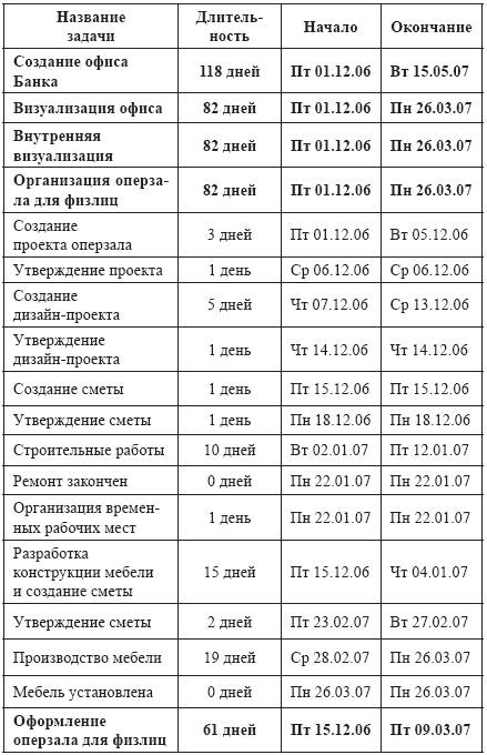Что же делать, если у Вас в Банке есть уже отделения, которые расположены не в лучших местах, может быть даже не на первой линии домов, закрыты бронированной дверью, отсутствуют витрины и большие вывески? Жители окрестных домов и прохожие, спешащие на работу, даже не представляют, что рядом с ними есть замечательный банк, который готов предоставить им максимальный набор услуг. Ответ на этот вопрос один. Начинаем визуализировать офис! Параллельно разрабатываем продуктовый ряд и рекламную стратегию, но первым должна быть готова визуализация. Потенциальные клиенты должны увидеть банк: Вот мы здесь и мы открыты для Вас! Проект по визуализации даже одного офиса представляет собой достаточно сложную процедуру, которую желательно автоматизировать. В своей проектной деятельности организации часто используют продукт Microsoft Project, позволяющий упорядочить ведения проекта. В качестве примера представим краткий проект по визуализации одного из офисов Банка.