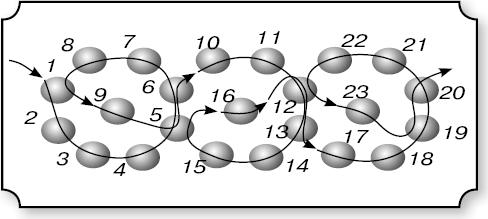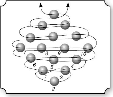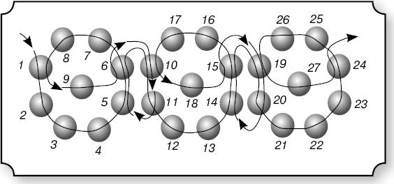Цепочка «зигзаг» может быть с бугорками. Набери семь бисерин, пройди через бисерину 4, далее по схеме (рис. 11).