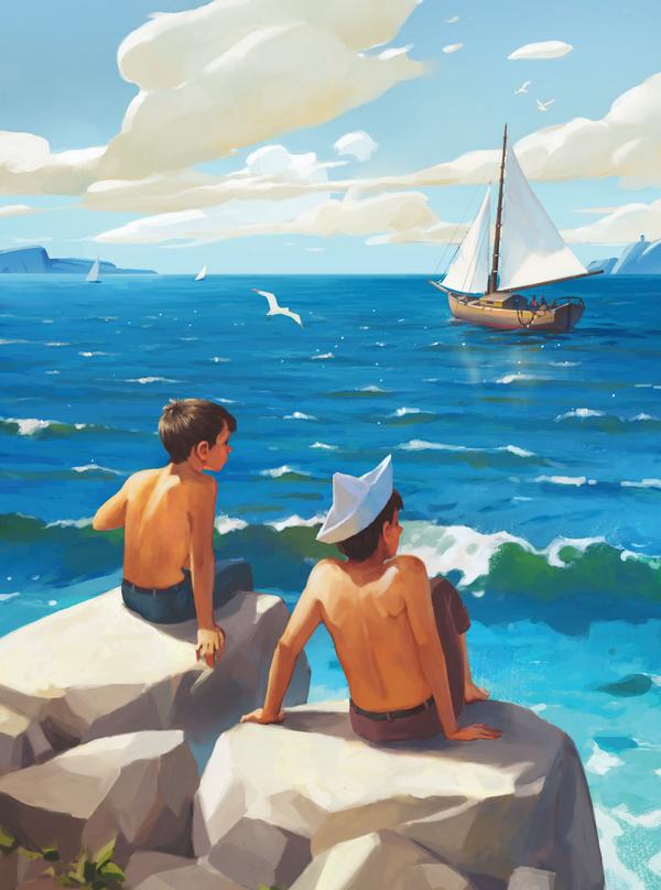 Братья даже придумали такую игру: пока лодка не исчезнет за горизонтом, надо успеть сочинить ей невероятное приключение, в котором рыбак обязательно должен встретиться с каким-нибудь препятствием, например бурей или пиратами, вступить с ними в неравную схватку и обязательно суметь одолеть врага.