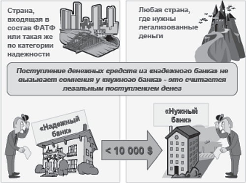 Имеют место случаи, когда клиент открывает в «надежном» банке (как правило, в развитой стране) счет и постоянно пополняет его за счет отчислений от своей профессиональной деятельности. Но просьба его заключается в том, чтобы при достижении суммы на счете около 10 000 дол. переводить их на другой счет (в другую страну). В последнем банке перевод средств из «надежного» банка не вызывает сомнений в легальном происхождении денег, и клиент остается вне подозрения. Однако для первого банка просьба отправлять суммы до 10 000 дол. должна была вызвать сомнения (рис. 3).