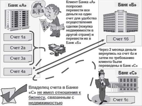 Далее рассмотрим пример, который показывает, насколько полезно бывает изучать характер самой сделки и ее экономическое обоснование (рис. 4). Один клиент банка «А» достаточно успешно действовал на рынке недвижимости, получая каждый год значительные доходы. Ему помогали члены его семьи. В банке «А» были открыты несколько счетов в разных валютах для удобства расчетов. Однажды клиент попросил перевести все деньги на один счет (сумма превышала 1 млн дол.). Свою просьбу он обосновывал тем, что хочет купить дорогую недвижимость в другой стране. Средства были собраны в один счет и переведены далее на счет в другой стране.