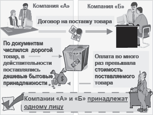 Аналогичный результат был достигнут в другой нашумевшей сделке, где участвовали две компании (рис. 7). Как и в первом примере, обе компании принадлежали одному лицу. Согласно взаимным договоренностям, компания «А» брала на себя обязательства поставить товар компании «Б». Товар имел высокую стоимость и был запакован в специальные ящики. Однако на таможне было установлено, что в ящиках находился совсем другой товар, а именно вместо дорогих товаров лежали дешевые бытовые принадлежности. Проверка показала, что сумма, заплаченная за этот товар, в несколько раз превышала стоимость поставляемого товара. После проведения расследования было установлено, что данная схема использовалась для легализации доходов, полученных преступным путем.
