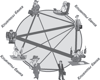 К высокому риску с позиций вероятности вовлечения банка в процессы отмывания незаконно полученных доходов должны быть отнесены операции клиентов по экспорту/импорту высокотехнологичных, дорогостоящих товаров, результатов интеллектуальной деятельности, услуг в области маркетинговых исследований, консультационных и юридических услуг, когда контрагентом выступает малоизвестная на рынке компания. Нуждаются в пристальном внимании и операции по получению клиентом денежных средств от иностранных общественных, неправительственных организаций, фондов и иных некоммерческих организаций в качестве финансовой помощи, в том числе в виде фантов, премий или финансирования гуманитарных программ. Например, используемые в коммерческих банках Люксембурга некоторые программные продукты имеют достаточно наглядные выходные формы, на которых отражено, насколько активно взаимодействовали между собой клиенты (рис. 8). На линии окружности обозначаются точками клиенты коммерческого банка и затем линиями обозначаются их совместные операции (сделки). Толщина линий зависит от количества таких совместных операций (сделок).
