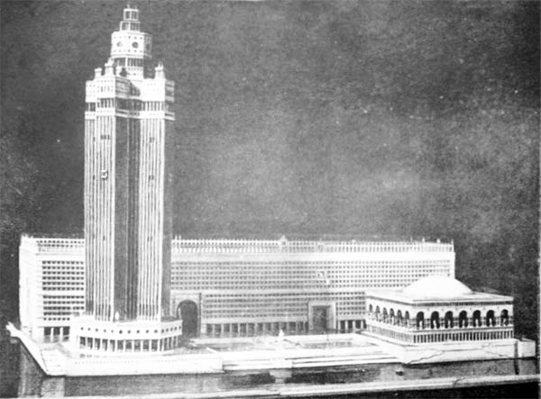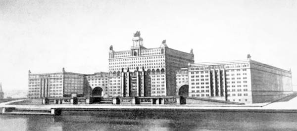 Конкурсный проект Дома Народного комиссариата тяжелой промышленности. Перспектива. Архитекторы Б. М. Иофан, A. M. Баранский при участии Я. Ф. Попова, Д. М. Циперовича, М. В. Адрианова, С. А. Гельфельда, Ю. П. Зенкевича, П. А. Куцаева, В. Б. Поляцкого. 1936 г.