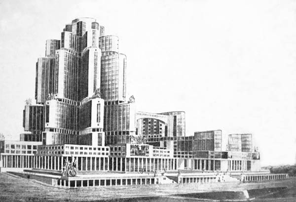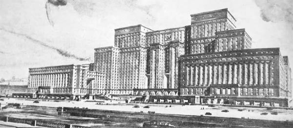 Конкурсный проект Дома Народного комиссариата тяжелой промышленности. Перспектива. Архитекторы А. А. Веснин, В. А. Веснин, С. В. Лященко. 1936 г.