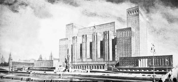 Конкурсный проект Дома Народного комиссариата тяжелой промышленности. Перспектива. Архитекторы В. А. Щуко, В. Г. Гельфрейх, П. В. Абросимов, А. П. Великанов, Ю. В. Щуко. 1936 г.
