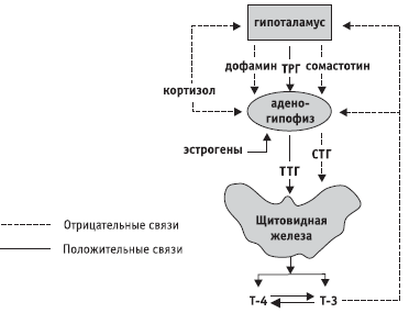 Первую составляют железы, функция которых регулируется тропными гормонами аденогипофиза. Их называют аденогипофиззависимыми железами, или железами-мишенями. К ним относятся щитовидная железа, корковое вещество надпочечников, эндокринные части половых желез. Взаимоотношения между аденогипофизом и железами-мишенями основываются на принципе «обратной связи». Например, аденогипофиз выделяет в кровь тиреотропный гормон, который стимулирует выделение гормона щитовидной железы – тироксина. Поступивший в кровь тироксин угнетает выделение тиреотропного гормона гипофиза.