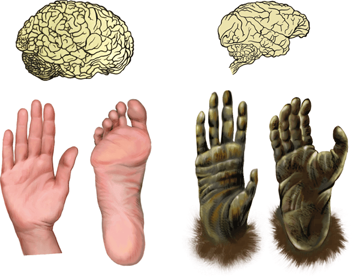 Из этого рисунка видно, в чем сходство и различие между мозгом и конечностями человека и обезьяны}