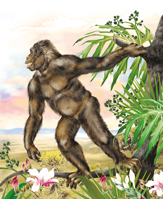 Одним из самых ранних гоминоидов является обезьянка, найденная в Восточной Африке, так называемый проконсул. Возраст этих останков – приблизительно 25 миллионов лет. Но вскоре в Африке появились и другие представители человекообразных обезьян: дриопитеки, микропитеки, афропитеки и др. Вес их тела варьировал от 3 до 150–170 кг (веса самки гориллы), питались они главным образом фруктами и молодыми листьями. Ученым посчастливилось найти кости конечностей некоторых из них, благодаря чему мы знаем, что гоминоиды передвигались на четырех ногах и вели преимущественно древесный образ жизни.
