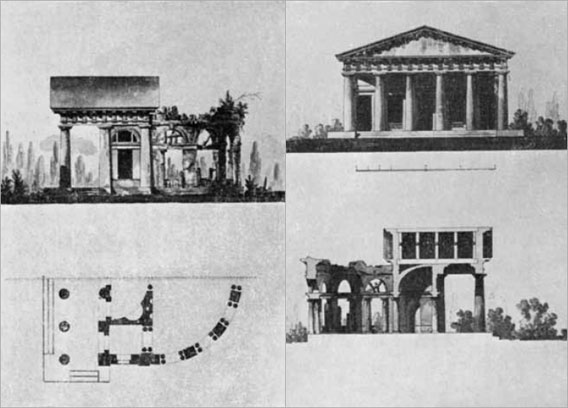 Иногда и оригинальное творчество второй половины XVIII века сознательно отмечается патиной времени как знаком приобщения к наследию. Так, Ф.Ф. Щедрин лишает своего «Марсия» рук, будто руинируя его. Дж. Кваренги создает Кухню-руину в Екатерининском парке Царского Села, одевая в живописное рубище развалин только что отсроенное вполне функциональное здание. Эта традиция резонирует и в Москве. Так, Н.А. Львов в проекте «Птичника» для московского парка А.А. Безбородко контрастно соединяет в одном здании целый нетронутый портик и искусственно «разрушенную» экседру.