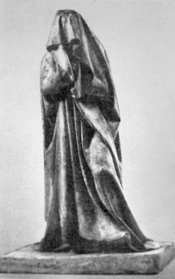Русская скульптура этой поры столь беззаветно предана классике, что почти никак не соприкасается с готикой. Но именно почти. Пока известен лишь один случай: «Этюд драпировки», относимый в ГРМ к творчеству Гордеева[53]. Это небольшая фигура в рост, столь пышно задрапированная тяжелой тканью, что даже неясно, мужская или женская модель перед нами. Задача работы академическая – изучение складок ткани. Но сама идея фигуры, не выявленной, а скрытой тканью, лицо, «пропавшее» в глубокой тени наброшенной на голову драпировки и потому даже вообще не изображенное, – все могло быть почерпнуто из позднего, почти на рубеже с Ренессансом, западноевропейского Средневековья (имеется в виду нидерландская скульптура первой половины XV века)[54]. Заметим попутно, что вопреки предполагаемому готическому происхождению основной композиционной идеи складки трактованы вполне классицистически.