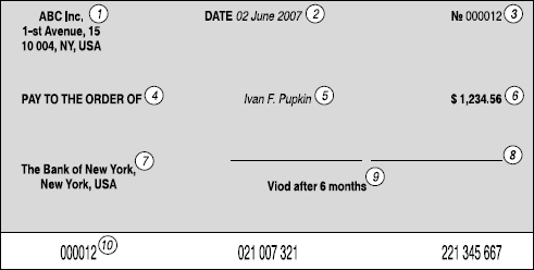1 – лицо или компания, выписавшего чек; 2 – дата выписки чека; 3 – номер чека; 4 – чековая метка; 5 – бенефициар (получатель) выручки по чеку; 6 – валюта и сумма чека; 7 – банк-плательщик по чеку; 8 – подпись лица или компании, выписавшего чек; 9 – срок действия чека; 10 – номер чека (дублируется)