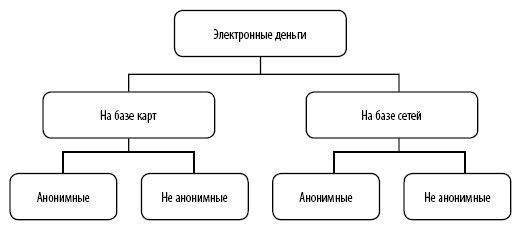 Классические системы электронных денег можно разделить на два основных вида по носителю информации: на базе карт и на базе сетей. Конечно, «на базе карт» – это условное обозначение, роль карты может исполнять любой предмет, содержащий средство для хранения информации. В свою очередь, и первая, и вторая группа подразделяются на анонимные системы, разрешающие проводить операции без идентификации пользователя, и неанонимные системы, требующие обязательной идентификации участников системы (рис. 1).