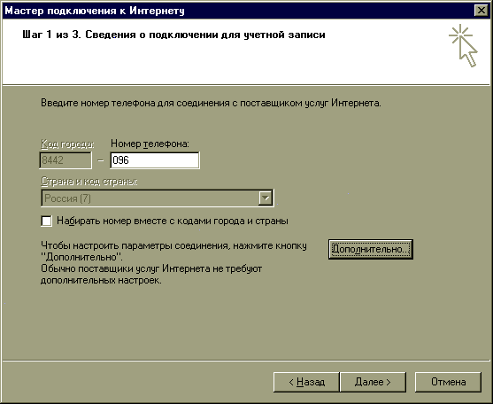 Здесь нам необходимо указать телефонный номер (желательно только цифры без разделительных пробелов и дефисов) в поле ввода Телефон. В выпадающем списке Код страны или области уже указан код России, и эту строку надо оставить без изменения. В том случае, если наш провайдер находится в другом городе (а ситуации, когда к провайдеру приходится дозваниваться по межгороду, еще бывают в России), необходимо указать код города в одноименном поле ввода. Осталось нажать кнопку Далее.