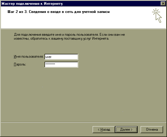 Логин и пароль вы вносите в соответствующие поля ввода диалогового окна второго этапа подключения, как это показано на рис. 1.12. Обратите внимание, что пароль отображается только звездочками. Сделано это в целях безопасности, чтобы никто не смог увидеть его даже случайно. Естественно, это несколько затрудняет зрительный контроль правильности пароля, поэтому следует максимально внимательно отнестись к его вводу. Проверьте, какой установлен язык, русский или английский, не включен ли режим постоянного ввода заглавных символов, и тщательно соблюдайте регистр вводимых символов. После того как мы указали пароль и логин, необходимо нажать кнопку Далее.