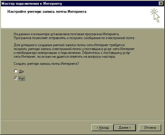 На этом настройка параметров телефонного соединения, предназначенного для связи с провайдером, заканчивается. Однако мастер подключения может увидеть, что на компьютере установлена программа, предназначенная для работы с электронной почтой. Одной из таких программ является Microsoft Outlook, входящая в состав пакета Microsoft Office. С огромной долей вероятности можно утверждать, что эта программа установлена на вашем компьютере. Следовательно, мастер подключения к Интернету обнаружит ее и предложит создать учетную запись еще и для электронной почты, как это показано на рис. 1.13. От этого предложения можно отказаться, выбрав переключатель Нет, т. к. вы можете настроить учетную запись для электронной почты. Об этой процедуре будет подробно рассказано в следующей главе.