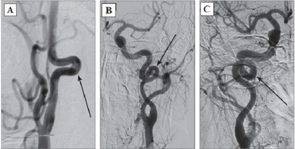 Fig. 3: Types of pathological deformations based on CAG: A – C-shaped tortuosity of ICA (arrow indicated); B – S-shaped tortuosity of ICA (arrow indicated); C – ICA loop (arrow indicated).