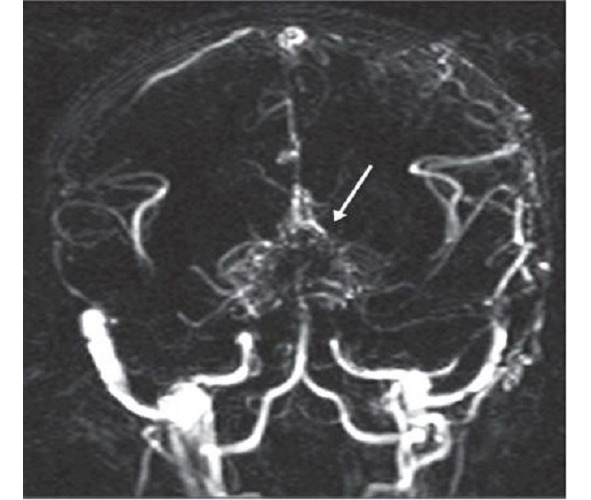 Fig. 4: MRA of a patient with the moyamoya disease. The secondary formation of anastomotic network resembling a cloud of smoke is indicated with an arrow.