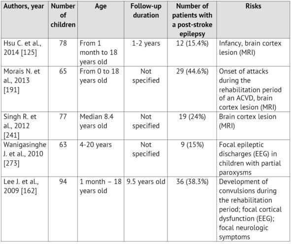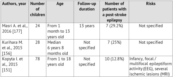Table 1: Epilepsy formation risk in children, who had suffered an ischemic stroke (according to literature data from 2010 till 2015)