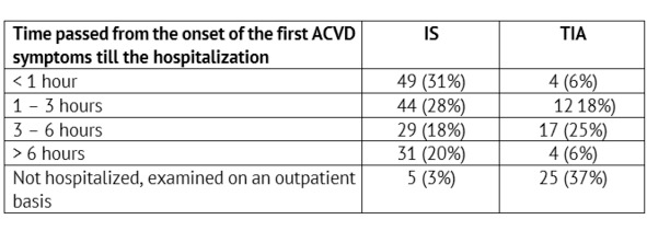 Table 2: Time passed from the onset of the first ACVD symptoms till the admission to an emergency / neurology specialized healthcare facility