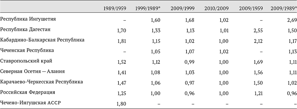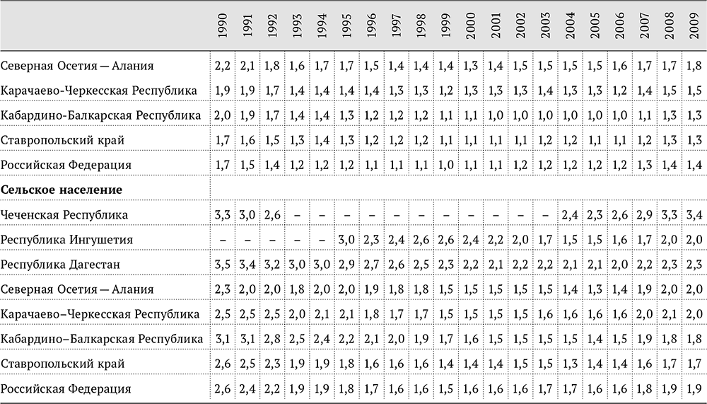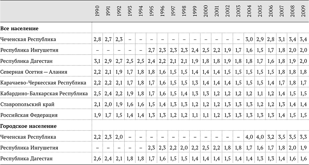 Данные тенденции позволяют многим исследователям вполне справедливо ставить под вопрос адекватность статистического измерения роста численности населения в северокавказских республиках (см. табл. 1.2), особенно в Дагестане, Ингушетии и Чечне[10]. Однако тут необходимо учитывать и обратную закономерность. Если рождаемость регистрируется адекватно, а численность населения завышена, искусственно увеличивается знаменатель при расчете коэффициентов рождаемости и значение показателя становится меньше. Таким образом, можно предположить, что представленная статистика рождаемости несколько преуменьшает реальные величины. Тем не менее это не меняет принципиально общей тенденции – Северный Кавказ приближается к завершению демографического перехода, и при смене поколений фактор высокой рождаемости не должен играть столь важную роль в провоцировании конфликтов, какую он играет сейчас.