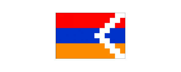 Флаг НКР учрежден решением Верховного Совета республики от 2 июня 1992 г. Он представляет собой прямоугольное полотнище (пропорции 1: 2) с горизонтальными равновеликими по ширине полосами красного, синего и оранжевого цветов с тянущимся с углов вольной стороны до 1/3 полотнища пятизубчатым ступенчатым ковровым узором.